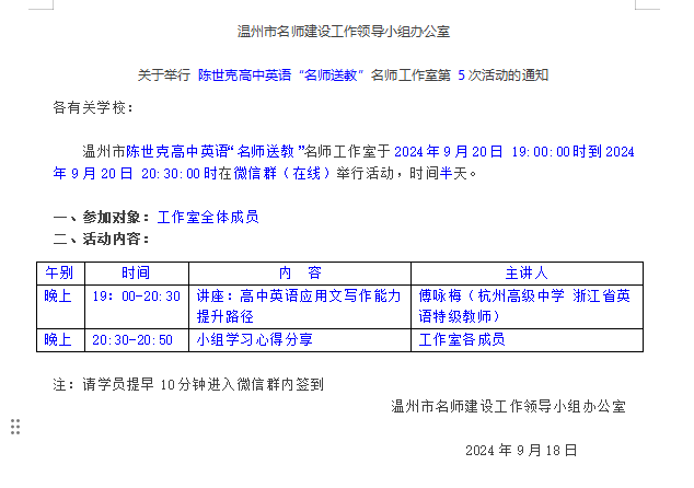 关于举行温州市陈世克高中英语“名师送教”工作室第5次活动的通知